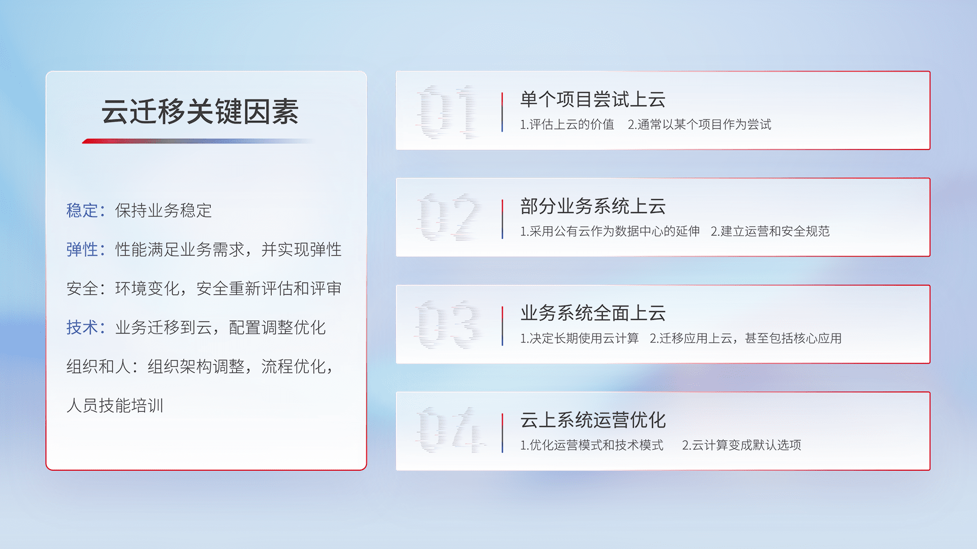 结合实际业务,,从规划设计、、、、云平台选型、、云原生改造、、、数据迁移、、集成交付,,迁移全过程为客户识别最佳上云路径,,,做好风险识别管理,,,,设计网络架构、、身份权限、、安全审计合规、、、操作审计、、、日志审计、、、、监控告警策略、、、多站点容灾设计等,,,对云上基础设施进行整体规划,,提升IT治理水平,,,,以满足弹性、、、高可用、、、高性能的需求。。。